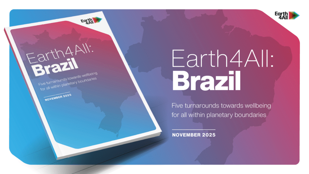 Earth4All will be holding a special event to launch the report and discuss its findings with an expert panel on Thursday 13 November at 13:15 – 14:15 BRT in the Planetary Science Pavilion at COP30, Belém. The event is co-hosted by Sandrine Dixson-Declève, Executive Chair, Earth4All and Carlos Nobre, Earth system scientist and Chair of the Earth4All Transformational Economics and Planetary Boundaries Commission. Panellists include Izabella Mônica Vieira Teixeira, Former Minister of Environment of Brazil, co-chair of the UN International Resource Panel; Gustavo da Cunha Westmann, Special Advisor for International Affairs, General Secratariat of the Presidency of Brazil; Maiara Folly, executive director and co-founder, Plataforma CIPÓ; and Robert Muggah, co-founder, Igarapé Institute.